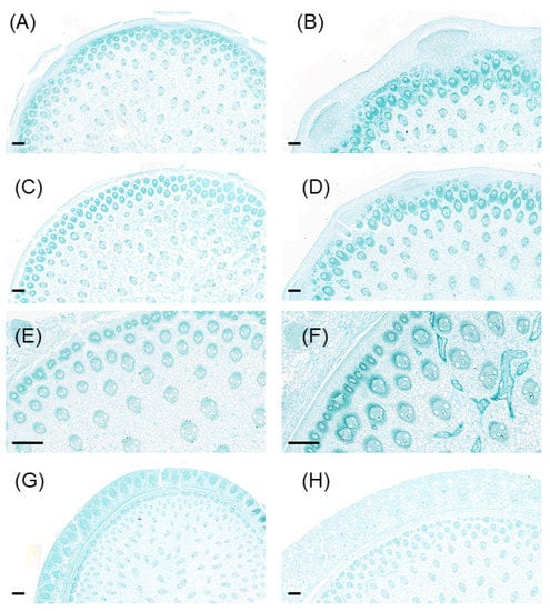 Transverse sections show the stem base node (Node 1, (A,B)), two nodes above stem base ((C,D) for Node 2, and (E,F) for Node 3, respectively), and Node 8 (G,H) in maize plants under low (A,C,E,G) and medium N (B,D,F,H) availability at 62 days after sowing. Scale bars represent 500 μm.