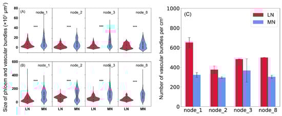 The size of phloem (A) and vascular bundles (B), and number of vascular bundles per unit area (cm2) (C) in the stem base node (node_1), two nodes above stem base (node_2 and node_3), and the node_8 of maize plants at 62 days after sowing under low and medium N supply. The solid line and dash line within each box represent the median and mean values of all data in panels (A) and (B). The top and bottom edges represent the 75 and 25 percentiles, and the top and bottom bars represent the 95 and 5 percentiles of all data, respectively. ***, p < 0.001.