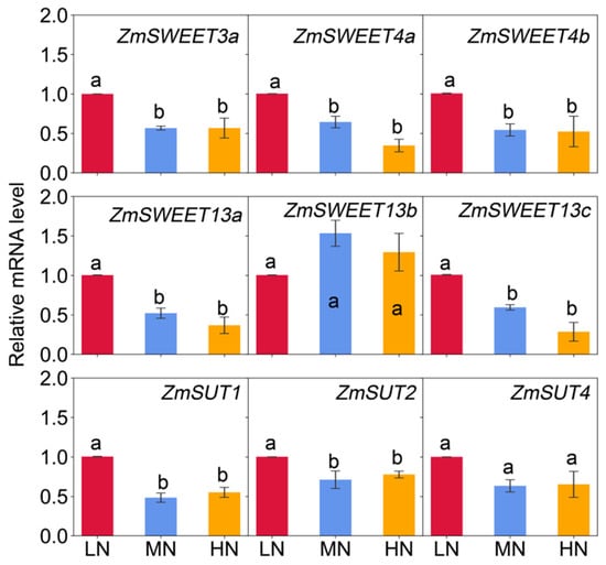 The relative expression level of genes involved in sugar transport in leaves at 62 days after sowing. Columns with no letter in common are significantly different between nitrogen treatments in each panel (p < 0.05). Vertical bars indicate the standard error of the mean (n = 4).