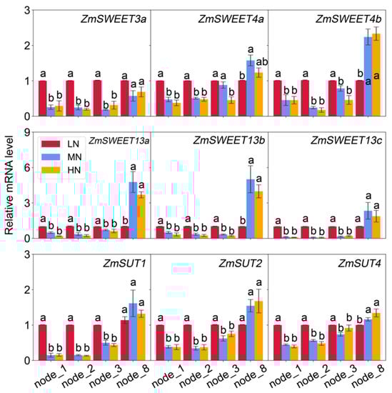 The relative expression level of genes putatively involved in sugar transport in nodes at 62 days after sowing. Columns with no letter in common are significantly different between nitrogen treatments in each panel (p < 0.05). Vertical bars indicate the standard error of the mean (n = 4).