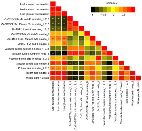 Correlation analysis of sugar concentrations, expression levels of sugar transporters, vascular bundle morphology, and total N uptake in maize plants. *, p < 0.05; **, p < 0.01.
