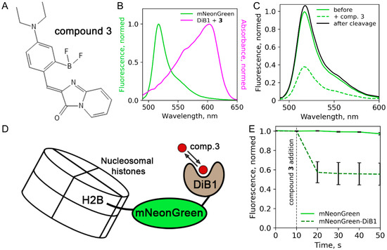 FRET efficiency measurements in vitro and in living cells. (A) Structure of compound 3. (B) Spectral overlap between the fluorescence emission spectrum of mNeonGreen and the absorbance spectrum of the DiB1:3 complex. (C) mNeonGreen emission spectra before the compound 3 addition (green line), after the compound 3 addition to the final concentration of 1 μM (dashed green line), and after the enzymatic cleavage (black line). (D) Scheme of the H2B-mNeonGreen-DiB1 used in live-cell experiment. (E) Fluorescence intensity of mNeonGreen in live HeLa cells transiently transfected with H2B-mNeonGreen (green solid line) or H2B-mNeonGreen-DiB1 (green dashed line); vertical dashed line indicates the addition of compound 3 to the final concentration of 3 μM; error bars represent standard deviation (technical replicates = 23).