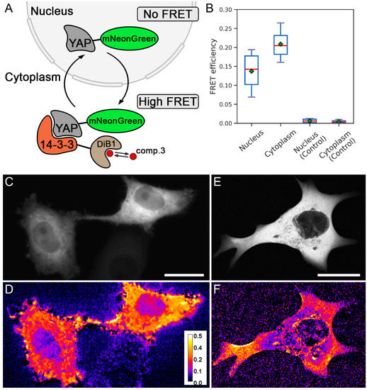 Finally, we applied the modulated FRET acceptor to assess the protein–protein interaction of YAP1 and 14-3-3 [23] (Figure 5A). It is known that 14-3-3 locates diffusely in the cytoplasm, while the YAP1 protein is shuffling between the cytoplasm and the nucleus, depending on the phosphorylation, cell cycle, and other factors [24].