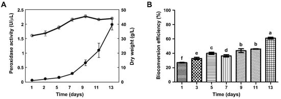 Effect of culturing time on peroxidase activity in the CM from grapevine callus suspension cultures. (A) Guaiacol peroxidase activity in the CM (filled dots) and cell growth curve (biomass, dry weight) of grapevine callus suspension cultures (open dots) were measured at two-day intervals for 13 days of culturing. (B) The bioconversion efficiency of trans-resveratrol to δ-viniferin was measured using the grapevine CM with different culture periods. Grapevine callus (2 g) was cultured in 20 mL MS1D liquid medium, and the CM supernatant was harvested at the indicated time points after callus suspension culturing. The bioconversion was conducted by adding trans-resveratrol (1 mg) and H2O2 (6.8 mM) to the CM. Data are the means of three independent replicates ± SD. Same letter(s) indicate no significant difference (Duncan’s test; p ≤ 0.05).
