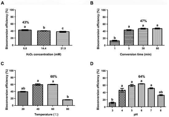 We further investigated the effect of pH in a range from 3.0 to 8.0, and bioconversion efficiency was highest at pH 6.0 (64%) under the optimized conditions of 60 °C, 30 min incubation time, and 6.8 mM H2O2. At pH 5.0–7.0, efficiency was at least 50%; however, it decreased to 32% at pH 8.0 and to 11% at pH 3.0 (Figure 3D). These results suggested high bioconversion efficiency by extracellular peroxidases in grapevine CM under acidic conditions (pH 5.0–6.0) at 40–60 °C with 30–60 min incubation time and with 6.8 mM H2O2.