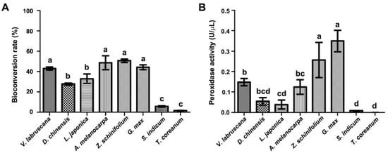 Determination of bioconversion efficiency (A) and guaiacol peroxidase activity (B) using the CM from various plant callus suspension cultures. The various plant calli (2 g) were cultured in 20 mL MS1D liquid medium, and CM was collected after five days of callus suspension culturing. The guaiacol peroxidase activity was determined by the reaction of 0.1 mL CM and 0.9 mL of the reaction mixture (25 mM guaiacol, 25 mM H2O2, 50 mM phosphate-buffered saline, pH 7.0) within 5 min. Values are presented as means ± SD. Same letter(s) indicate no significant difference (Duncan’s test; p ≤ 0.05).
