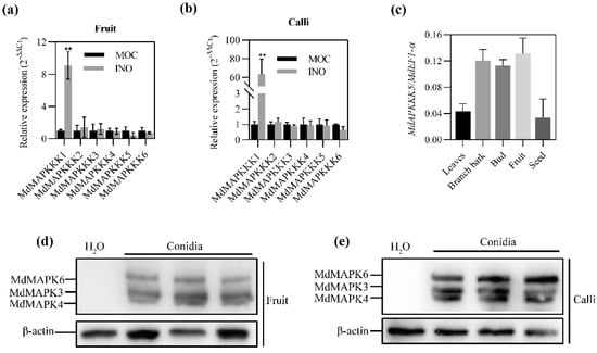 MdMAPKKKs’ expression and the activation of the apple MAPK cascade. (a) and (b) relative expression of MdMAPKKKs in the apple fruits and calli inoculated with B. dothidea. MOC, the apple fruits 130 days after full blossom (DAFB) or 3-week-old calli mock-inoculated with sterilized double distilled water. INO, the apple fruits or 3-week-old calli inoculated with B. dothidea. The inoculated or mock-inoculated calli and fruit tissues around the inoculation sites were collected 48 h after inoculation for gene expression analysis and immunoblotting. The mock-inoculated fruits and calli were used as control. The data were analyzed using two-way ANOVA followed by Sidak’s test. **, p < 0.01. (c) Relative expression of the MdMAPKKK1 gene in different apple tissues. (d) and (e) the MAPK cascade activation in fruits and calli inoculated with B. dothidea as revealed by immunoblotting with anti-PERK. MdMAPK3, MdMAPK4, and MdMAPK6 refer to putative apple homologues of AtMAPK3, AtMAPK4, and AtMAPK6, respectively.