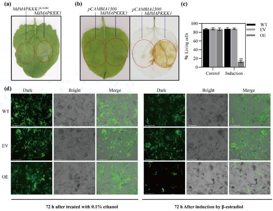 Previous research indicated that heterologous overexpression of AtMAPKKK5 induced cell death of Nicotiana benthamiana leaves [,]. To test if MdMAPKKK1 also induces cell death, MdMAPKKK1 was transiently overexpressed in Nicotiana leaves. Tissue necrosis was observed 2 d after infiltration with Agrobacterium harboring the MdMAPKKK1 gene under the control of the 35S promoter (Figure 2a), which is comparable to the tissue necrosis induced by AtMAPKKK5 [,]. The necrosis area was accompanied with ROS accumulation (Figure 2b). We mutated the putative ATP binding site of the MdMAPKKK1 protein from Lys360 to Met360 (K360M). The mutated MdMAPKKK1 (MdMAPKKK1K360M) did not induce cell death (Figure 2a). To determine if MdMAPKKK1 overexpression can also induced cell death in native organism, cDNA of MdMAPKKK1 was inserted into inducible pER8 vector and introduced into apple calli. After antibiotic screening and PCR confirmation, positive calli were treated with β-estradiol to induce MdMAPKKK1 expression. Obvious cell death was observed 72 h after induction by β-estradiol (Figure 2c,d), suggesting a relative lower basal expression of the MdMAPKKK1 gene during cell normal growth under the non-infection condition.