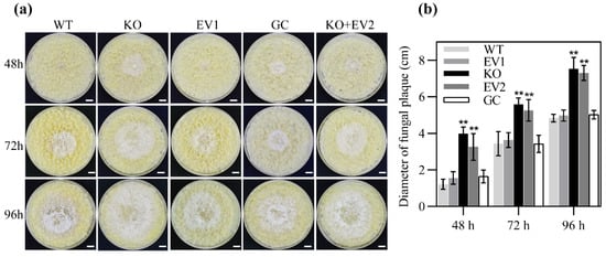 B. dothidea growth on calli. (a) Apple calli inoculated with B. dothidea. The 2-week-old calli were used for inoculation. The inoculation was performed by placing the mycelial discs on the center of the calli. The scale bars represent 9.0 mm. WT: wild type; KO: mutated calli generated by CAS9/CRIPR system. EV1: empty vector for gene editing; GC: genetic complemented calli. KO+EV2: KO calli transformed with empty vector for genetic complement. (b) Fungal growth evaluated by measuring the diameter of fungal plates. The bars represent means (± SD) from five calli dishes (n = 5). **, p < 0.01.