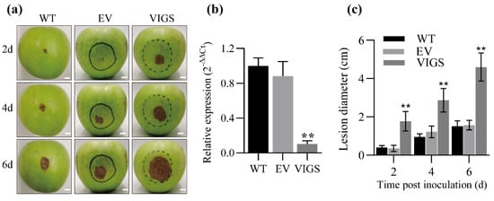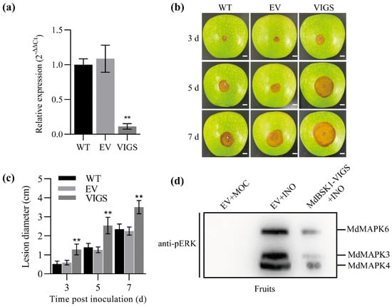 To further determine the effect of MdMAPKKK1 on the resistance to B. dothidea, we performed VIGS to knock down the MdMAPKKK1 gene in fruits. Then, the fruits were inoculated with B. dothidea and lesions were evaluated at 48, 96 and 144 hpi. MdMAPKKK1 expression was significantly reduced after VIGS (Figure 4a,b). Reduction in MdMAPKKK1 expression led to increased lesion of fruits by B. dothidea infection (Figure 3a,c), indicating that MdMAPKKK1 positively regulated apple resistance to B. dothidea.