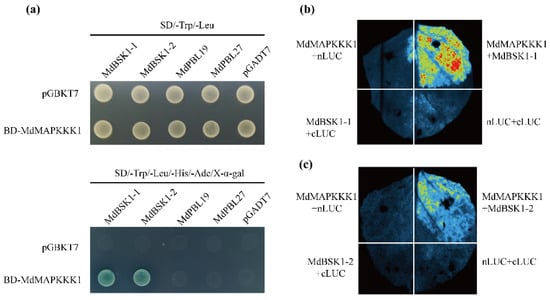 Interaction between BSK1 and MdMAPKKK1. (a) Point-to-point verification of the interaction between MdMAPKKK1 and MdBSK1 by yeast two-hybrid. The constructs were transformed into yeast Y2HGold stain and 10 μL suspension of yeast containing each pair of constructs dotted on the indicated SD medium. (b) and (c) split luciferase assay of the interaction between BSK1 and MdMAKKK1. N. benthamiana leaf co-infiltrated with Agrobacterium containing CLuc-MdBSK1 and MdMAKKK1K360M-NLuc. The luminescence images were captured using Newton 7.0 system.