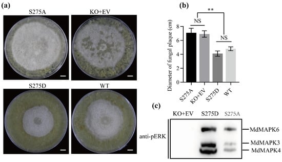 The interaction between MdMAPKKK1 and MdBSK1 leads to a speculation that MdBSK1 phosphorylates MdMAPKKK1. We aligned the amino acid sequence of MdMAPKKK1 with Arabidopsis MAPKKK5 protein. We found that MdMAPKKK1 has a putative phosphorylation site at Ser275 corresponding to Ser289 of Arabidopsis MAPKKK5 which was reported to be the BSK1 target site []. However, the MdMAPKKK1 protein has no phosphorylation sites corresponding to Ser599 and Ser682 of Arabidopsis MAPKKK5 which are critical for MAPKKK5 function [] (Supplementary Figure S4). To determine if mutation of the putative phosphorylation site targeted by MdBSK1 influences the resistance to B. dothidea, we introduced MdMAPKKK1S275A and MdMAPKKK1S275D into the MdMAPKKK1-KO calli. MdMAPKKK1S275A causes a loss of phosphorylation, while MdMAPKKK1S275D mimics constitutive phosphorylation []. The expression of MdMAPKKK1S275D under the control of the native promoter recovered the resistance to B. dothidea of MdMAPKKK1-KO calli. However, the expression of MdMAPKKK1S275A did not affect the resistance of calli to B. dothidea (Figure 6a,b). Next, we examined the activation of MAPKs after inoculation with B. dothidea. We found that B. dothidea induced MAPKs activation in both MdMAPKKK1S275D- and MdMAPKKK1S275A-expressed calli, but MAPK activation in MdMAPKKK1S275A-expressed callus was significantly reduced compared with that in MdMAPKKK1S275D-expressed callus. The results indicate that MdBSK1 mediates the signal transduction of B. dothidea infection to MdMAPKKK1 by phosphorylation (Figure 6c).