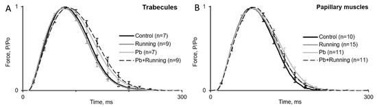 Figure 1 shows averaged isometric contraction curves for the trabecules (Figure 1A) and papillary muscles (Figure 1B) from the control and the three exposed groups, normalized to their amplitudes to enable comparison.