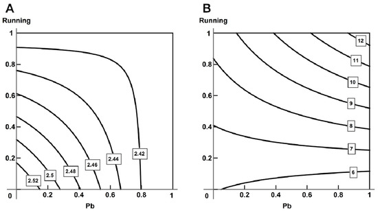 In general, the isobole analysis did not reveal indices in which exercise would explicitly enhance the effect of lead intoxication on the indices of the cardiovascular system; although, for some combinations of doses, producing complicated pictures of combined action, we observed synergism in some indices (for instance, Figure 11B and Figure 12B,C).