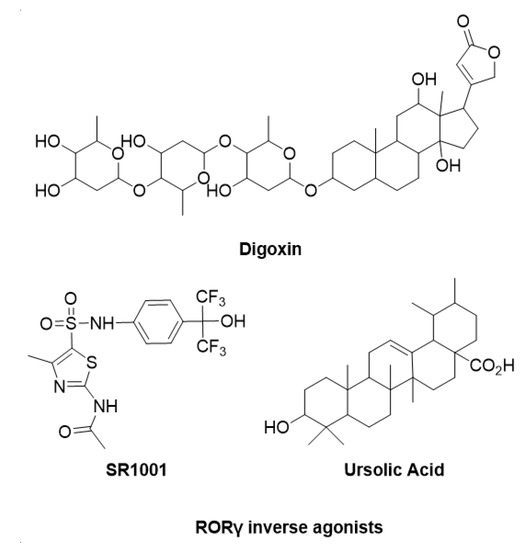 Nuclear hormone receptors are a large family of ligand-dependent transcription factors that play essential roles in regulating many important physiological functions, and they have been implicated in several diseases, including cancer, inflammation, metabolic and autoimmune disorders [1,2]. The retinoic acid receptor–related orphan receptors (RORs), in particular RORα (NR1F1) and RORγt (a truncated form of RORγ (NR1F3) that is specifically expressed in the thymus), are essential for the development of T helper 17 (Th17) cells [3,4]. There is compelling evidence that IL-17-producing Th17 cells play a critical pathogenic role in chronic inflammation and autoimmune diseases, including multiple sclerosis, rheumatoid arthritis, inflammatory bowel disease, type I diabetes, and psoriasis [5,6], which suggested RORs as attractive targets for treating autoimmune disorders. Indeed, it was soon discovered that the RORγ inverse agonists SR1001, digoxin, and ursolic acid could suppress Th17 differentiation and the onset of disease in an experimental autoimmune encephalomyelitis mouse model of multiple sclerosis [7,8,9], Figure 1.