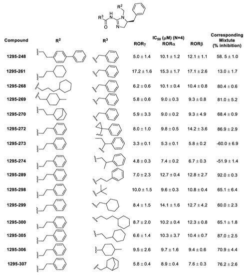 Effect of individual controls from library 1295 on ROR-dependent luciferase activity. The IC50 values (in µM) for each cell line and the chemical group at each position are shown. The right column shows the percentage of inhibition observed in RORγ cells incubated with 10 µg/mL of the corresponding mixture library containing the indicated fixed R2, or R3 functional groups.