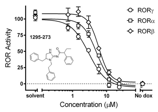 Dose response of compound 1295-273 in ROR cells. TRex-CHO-RORγ/α/β cells were incubated with the indicated concentrations of 1295-273 for 20 h, when cell viability and luciferase activity were determined as indicated in materials and methods. The percentage of normalized activity (luciferase/fluorescence) for each cell line is shown. The experiment was repeated twice with quadruplicate data points and the results of one typical experiment are shown.