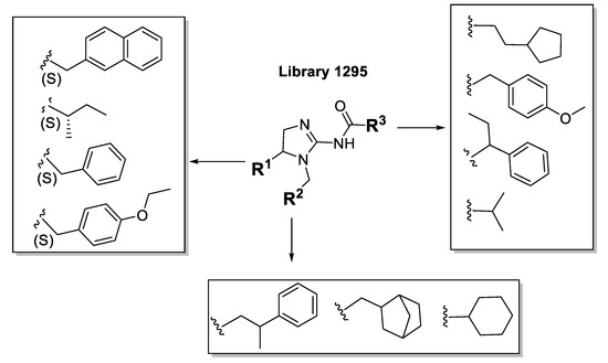 The 1,5-disubstituted acylated 2-amino-4,5-dihydroimidazole library 1295 is made from 107 mixtures (34 R1 × 37 R2 × 36 R3) and 107 individual control compounds prepared in parallel to the positional scan mixture-based library, [19,25,36,39] and served as controls to verify that the individual building blocks used at each of the variable positions could be successfully incorporated into the synthesis of the mixture libraries.
