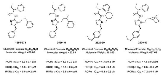 Identified active compounds from the deconvolution of library 1295. The IC50 of the most active compounds with all three RORs (N = 4) are shown.