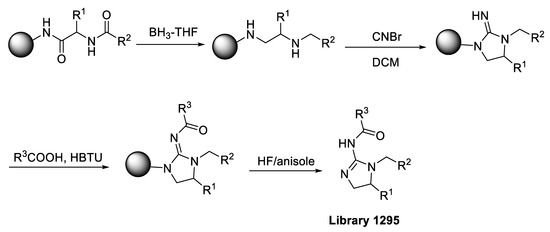 The R groups making the diversities R1, R2, and R3 were selected in a way that they display a range of different physicochemical properties including hydrophobic, hydrophilic, polar, apolar, basic, acidic, hydrogen acceptors, hydrogen donators, aliphatic and aromatic properties. The synthesis of library 1295 is described in Scheme 1 [40].