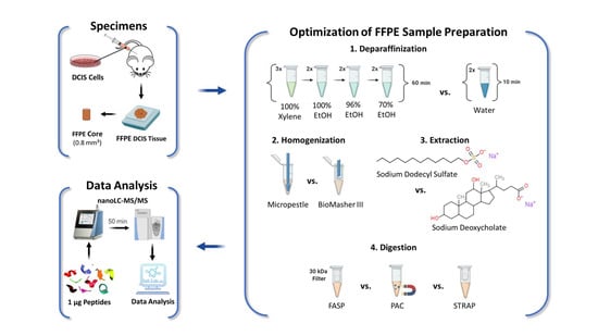 Experimental Design. Xenografts were generated from human DCIS cells and tumors were resected after 1.5 weeks, followed by formalin-fixation and paraffin-embedding, as described in [17]. One-millimeter-diameter FFPE cores were used to optimize individual steps of the FFPE sample preparation: (1) deparaffinization, (2) homogenization, (3) extraction, and (4) digestion. Peptide samples were analyzed by nano-LC-MS/MS label-free quantitation (LFQ) to compare the performance of the evaluated protocols for each step of the sample preparation workflow.