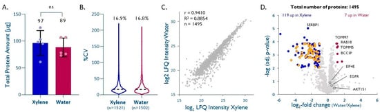 Database searches performed on individual samples led to the identification of 933 ± 26 (depX) and 835 ± 80 (depW) proteins, 6778 ± 294 (depX) and 5925 ± 608 (depW) peptides, and 8400 ± 352 (depX) and 7244 ± 815 (depW) peptide-spectrum matches (PSM), respectively, from 23,008 ± 561 (depX) and 22,764 ± 1378 (depW), acquired MS/MS spectra. A quantitative comparison of the five depW and depX replicates using label-free quantitation (LFQ) led to the quantitation of 1502 (depW) and 1521 (depX) unique proteins across the five replicates, with intra-method CVs of 16.8% (depW) and 16.9% (depX; Figure 2B). The LFQ-derived intensities of 1495 proteins that were quantified between the two methods show a good agreement between depW and depX (correlation coefficient R = 0.94, slope = 0.97, Figure 2C). In general, the choice of the deparaffinization method did not significantly impact the recovery of hydrophobic or hydrophilic proteins (see Supplementary Table S1); however, almost half of the quantified high-abundance cytosolic ribosomal proteins showed poorer recoveries with depW (Figure 2D; Benjamini–Krieger adjusted p value <0.01, median depW/depX = 0.25), while membrane and nuclear proteins of interest in cancer biology, such as TOMM5 [19,20], TOMM7 [19,21], RAB18 (RAS related protein) [22,23], and nuclear BCCIP (BRCA2 interacting protein) [22,24], had significantly better recoveries using depW (adj. p < 0.01, depW/depX= >2.08). Notably, other important cancer proteins, such as EGFR (adj. p = 0.20, depW/depX = 1.36), EIF4E (adj. p = 0.13, depW/depX = 1.19), or AKT1S1 (adj. p = 0.31, depW/depX = 1.71) seem to show better recoveries using water-based deparaffinization, but this was not statistically significant.
