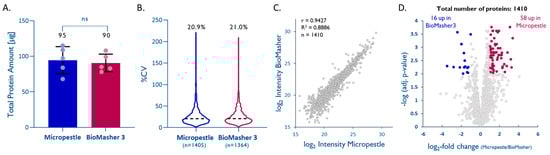 Based on the bicinchoninic acid assay (BCA), both methods yielded similar protein amounts (95 ± 19 µg for homMP vs. 90 ± 13 µg for homBM; Figure 3A). LFQ of the five replicates per method enabling the quantitation of 1405 (homMP) and 1364 (homBM) unique proteins showed that both methods are equally reproducible (%CVs of 20.9% and 21.0% for homMP and homBM, respectively; Figure 3B). LFQ-derived normalized abundances of 1410 proteins that were quantified by both methods showed a good correlation (r = 0.94, slope = 0.98, Figure 3C), with a tendency toward higher intensities for homMP (Figure 3D). The proteins with significantly differential recovery (Figure 3D), however, do not seem to indicate a role of pI, hydrophobicity, subcellular localization, or molecular weight in the enrichment/depletion with either method (see Supplemental Table S2). Based on a slightly better overall performance, ease of use, and lower cost, we prefer the disposable micropestle to the BioMasher III.