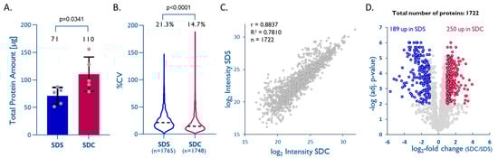 LFQ data on 1748 (exSDC) and 1765 (exSDS) quantified unique proteins also showed a higher reproducibility for exSDC than for exSDS (%CV of 14.7% vs. 21.3%) (Figure 3B). A direct comparison using LFQ enabled the quantitation of 1722 unique proteins quantified by both methods and showed a slight tendency towards higher intensities, and consequently, are more likely to be a better extraction efficiency for exSDC (Figure 3C,D). A closer look into the physicochemical properties of proteins exclusively quantified in each method reveals that exSDC is significantly better for extraction of larger (unpaired t-test, p = 0.0001), more acidic (unpaired t-test, p = 0.005), and more hydrophilic proteins (unpaired t-test, p = 0.0001) than exSDS (see Supplemental Table S3).
