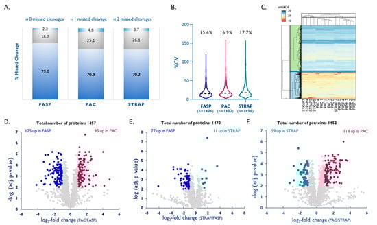 Comparison of PAC and STRAP with FASP. (A) Efficacy of tryptic digestion shown by percentage of missed cleavages. (B) Intra-method %CVs based on all quantified proteins, median %CVs are given. (C) Hierarchical clustering [49] of all quantified proteins, colors reflect log2-normalized abundances. (D–F) Volcano plots highlighting proteins that were significantly enriched by either method (multiple hypothesis testing using FDR-based approach by Benjamini–Krieger, FDR 1%).