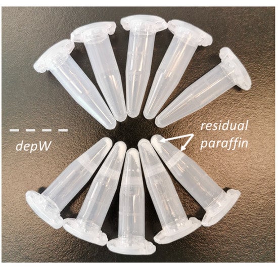 - depW (modified from [14]): The samples were washed 2× with 500 µL of hot deionized water and incubated for 1 min at RT under vigorous vortex mixing. Each washing step was followed by centrifugation at 20,000× g for 5 min at 4 °C. The supernatant, containing paraffin either floating on the liquid surface or stuck to the wall of the tube (Figure 7), was discarded and the deparaffinized and rehydrated core was transferred to a clean LoBind Eppendorf tube.