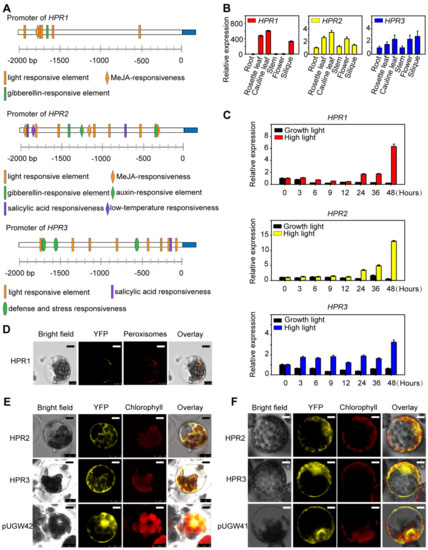 The expression pattern analysis of HPR1, HPR2 and HPR3. (A) Cis-acting regulatory elements analysis. The 2-kb DNA fragments at upstream of the ATG starting code of the HPR1, HPR2 and HPR3 genes were analyzed using PlantCARE. (PlantCARE address: http://bioinformatics.psb.ugent.be/webtools/plantcare/html/, accessed on 17 December 2021). (B) Expression patterns of HPR1, HPR2 and HPR3 in various organs of four-week-old Arabidopsis analyzed via quantitative RT-PCR. Data shown are means ± SD, n = 3, with three independent replicates. ACTIN was used as an internal control. (C) Expression of HPR1, HPR2 and HPR3 in leaves of Arabidopsis plants exposed to continuous high light intensity 350 µmol·m−2·s−1. Values represent means ± SD, n = 3, with three independent replicates. ACTIN was used as an internal control. (D) Subcellular localizations of HPR1. Confocal microscopic images of YFP-HPR1 fusion proteins expressed transiently in protoplasts of Arabidopsis wild types. Proteins fused with mCherry, which located in the peroxisome as the marker. Bars = 10 µm. (E) Subcellular localizations of HPR2 and HPR3. Confocal microscopic images of YFP-HPRs fusion proteins expressed transiently in protoplasts of Arabidopsis wild types. Free YFP of pUGW42 was used as a control. YFP fluorescence, chloroplast autofluorescence and merged images are shown. Bars = 10 µm. (F) Subcellular localizations of HPR2 and HPR3. Confocal microscopic images of HPRs-YFP fusion proteins expressed transiently in protoplasts of Arabidopsis wild types. Free YFP of pUGW41 was used as a control. YFP fluorescence, chloroplast autofluorescence and merged images are shown. Bars = 10 µm.