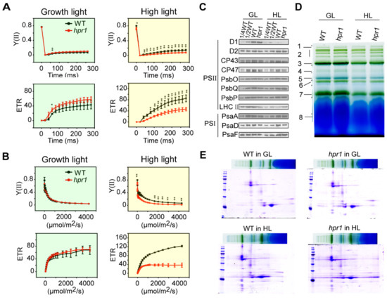 Photosystem analysis in WT and hpr1 mutants. (A) Slow chlorophyll fluorescence induction kinetics of four-week WT and hpr1 cultivated at growth light (80 µmol·m−2·s−1) and high light (350 µmol·m−2·s−1). Y(II), quantum yield of PSII photochemistry; ETR, electron transport rate through PSII. Values shown are means ± SD, n = 3, with three independent replicates. Asterisks show significant differences compared to WT: *, p < 0.05; ** p < 0.01 (Student’s t-test). (B) Light response curves of PSII of four-week-old WT and hpr1 cultivated at growth light of 80 µmol·m−2·s−1 and high light intensity of 350 µmol·m−2·s−1. Values shown are means ± SD, n = 3, with three independent replicates. Asterisks show significant differences compared to WT: * p < 0.05; **, p < 0.01 (Student’s t-test). (C) Western blot analysis of photosystem proteins in four-week-old WT and hpr1 mutant plants under growth light (GL, 80 µmol·m−2·s−1) and high light intensity (HL, 350 µmol·m−2·s−1). Immunoblot analysis was performed with antibodies against the indicated thylakoid membrane proteins. (D) Blue native gel analysis of photosynthetic complexes of four-week-old WT and hpr1 mutant plants. Annotation of the different complexes: 1, NDH-PSI; 2, PSII supercomplexes; 3, PSI monomer, PSII dimer and PSII monomer with LHCII trimers; 4, PSI monomer and CF1 complex; 5, PSII monomer; 6, LHCII assembly; 7, LHCII trimers; 8, LHCII monomers. (E) Thylakoid proteins separated by BN gel in (D) were further subjected to the second dimension SDS PAGE.