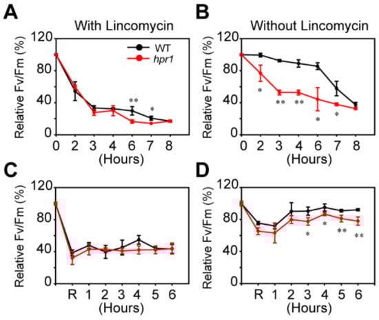 PSII photoinhibition analysis. (A,B) Photoinhibition of PSII in wild-type and hpr1 mutants was examined. Detached leaves from wild types and mutants were exposed to light at 1000 µmol·m−2·s−1 in the absence or presence of 1 mM lincomycin. The maximal photochemical efficiency of PSII (Fv/Fm) was measured after dark adaptation for 15 min. Data shown are means ± SD, n = 3, with three independent replicates. Asterisks show significant differences compared to WT: * p < 0.05; ** p < 0.01 (Student’s t-test). (C,D) Recovery of Fv/Fm after photoinhibition in wild-types and hpr1 mutants. Detached leaves from wild types and mutants were exposed to light at 1000 µmol·m−2·s−1 in the absence or presence of 1 mM lincomycin until the PSII activity was reduced to 60%, and then subsequently, shifted to low light (60 µmol·m−2·s−1) to recover. Data shown are means ± SD, n = 3, with three independent replicates. Asterisks show significant differences compared to WT: * p < 0.05; ** p < 0.01 (Student’s t-test).