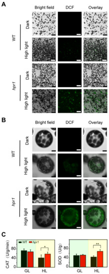 Detection of ROS production and removal. (A,B) Detection of ROS production. Protoplasts from WT and hpr1 mutants were treated with or without high light (1000 µmol·m−2·s−1) for 30 min, incubated with H2DCFDA (at a final concentration of 5 µM), and observed using LCSM as described in the Materials and Methods. (C) Superoxide dismutase (SOD) and catalase (CAT) activities in WT and hpr1 grown under growth light (GL, 80 µmol·m−2·s−1) and high light (HL, 350 µmol·m−2·s−1). Values shown are means ± SD, n = 3, with three independent replicates. Asterisks show significant differences compared to WT: * p < 0.05; ** p < 0.01 (Student’s t test).