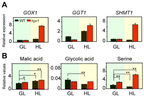 The major ROS-producing sites during abiotic stress are the chloroplasts, mitochondria, peroxisomes and apoplasts [23,24,25]. Photorespiration is involved in three organelles: the mitochondria, peroxisomes and chloroplasts. Most photorespiratory mutants are chlorotic and show growth retardation [26]. The phenotype of hpr1 mutants under high light was the same as that under photorespiratory conditions. Therefore, we assumed that high light intensity aggravated photorespiration rates. We performed qRT-PCR to examine the expression levels of some photorespiratory enzymes. GOX1, GGT1 and SHMT1 regulated photorespiration pathways at the upstream of HPR1. GOX1 oxidized glycolate into glyoxylate. GGT1 transformed glyoxylate into glycine. SHMT1 turned glycine into serine. GOX1 and SHMT1 exhibited the same trends both under growth light and high light intensity (Figure 6A). The expression levels of them in hpr1 mutants were similar to WT when growing under growth light intensity; however, the expression levels of them in hpr1 mutants were fivefold and 11-fold greater than WT when growing under high light intensity, respectively (Figure 6A). The expression of GGT1 was somewhat different, because GGT1 in mutants expressed obviously lower levels than WT under growth light, whereas they were higher than WT under high light intensity (Figure 6A). The intensity of light had no significant influence for wild types, hpr1 mutants were drastically affected (Figure 6A). Therefore, these results demonstrated that when HPR1 was absent, other photorespiratory enzymes were highly expressed to work against high light stress.