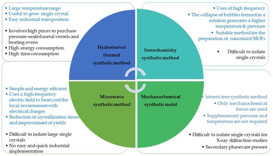 MOFs were originally synthesized by a method called solvothermal synthesis, which has been the most popular technique for MOFs synthesis. After two decades from the first MOFs reference, new improvements in synthesis approaches were accomplished. New methods, which involved the use of mechanochemical, electrochemical, sonochemical, and microwave-assisted technique, have been reported in literature with both advantages and disadvantages, as presented in Figure 1 [46,47,48,49].