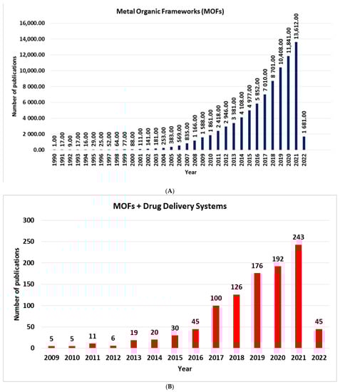 Number of publications from Web of Science: (A) “Metal Organic Frameworks” and (B) “Metal Organic Frameworks and Drug Delivery Systems”, from 1996 and 2009, through 21 March 2022.