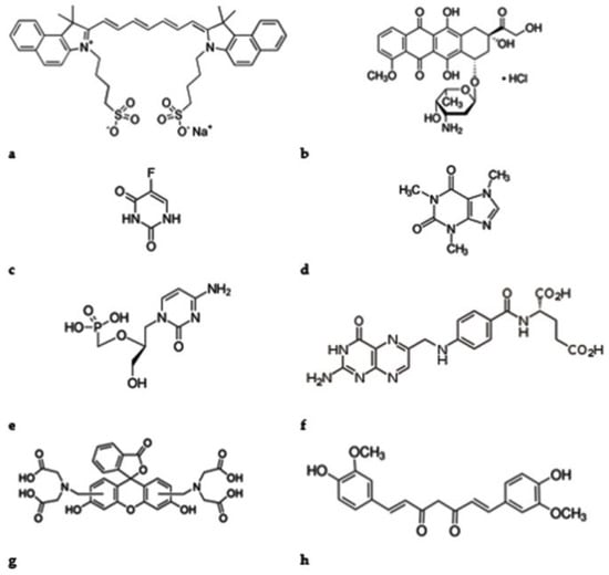 Some examples of drugs delivered by MOFs as DDS: (a)—indocianine green, (b)—doxorubicin hydrochloride, (c)—5-fluorouracil, (d)—caffeine, (e)—cidofovir, (f)—acid folic, (g)—calcein, (h)—curcumin.
