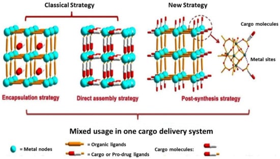 Wang and coworkers represent three cargo loading strategies: encapsulation, direct assembly, and post-synthesis strategy, to load MOFs with larger amounts of drugs, exemplified in Figure 4. The classification of strategies was made taking into account the location of the drug and the effect of cargo and host–guest interactions within the MOF frameworks.