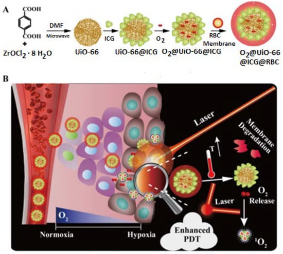 Synthesis of O2@UiO-66@ICG@RBC (A). Schematic mechanism of NIR-triggered O2 enhanced and discharging PDT (B). Reproduced with permission from [81]; Copyright (Gao, 2018), Elsevier Biomaterials.