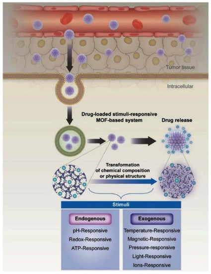 Cai and coworkers [110] explained the basic mechanisms of stimuli-responsive DDSs described in Figure 6. After injection, the stimuli-responsive drug delivery system (MOFs or other types of nanomaterials) gathers at the tumor site and is activated in two ways: one enhanced by permeability and preservation effect, and the other one enhanced by receptor–ligand affinity. When stimulated by specific triggers, the DDSs undergo a transformation, which induces drug delivery at the planned site in a controlled manner. Paralleled with healthy cells, the tumor cells microenvironment has different characteristics: higher temperature or lower pH, which helps to develop internal stimuli-responsive DDS. The external (light, magnetic field, temperature, ultrasound irradiation) stimuli-responsive systems envisage the MOFs gathered at the tumor site and are activated by triggers placed outside the body. The external stimuli-responsive systems offer improved continuous drug release capacity and have established a higher potential for biomedical application.