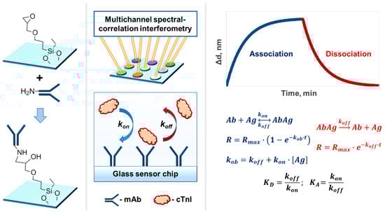 The kinetic characteristics of different clones of monoclonal antibodies to cTnI were studied using the multiplex label-free method of spectral correlation interferometry (Figure 2). As single-used sensor chips, standard microscope cover glass slips with epoxy-silane surface modification were employed. Prior to the label-free sensing, several monoclonal antibodies were covalently immobilized in different recognition spots on the epoxylated glass surface of a single sensor chip. The used immobilization technique is convenient for label-free biosensors because the epoxylated glass sensor chips can be stored for a reasonably long time without quality impairment, providing strong covalent sorption without need of activation [,,]. In the experiments, the sensor chip with the immobilized mAbs was placed into an mSCI-biosensor that quantitatively registered in real time variations in the thickness of a biolayer on the sensor chip surface, which occurred due to biochemical reactions. At first, a solution of cTnI antigen was pumped over the whole surface of the multi-spot sensor chip. The realized simultaneous and independent registration of the antigen binding in each registration spot enabled rapid and efficient characterization of all immobilized monoclonal antibodies. The dissociation of the formed immune complexes was registered at the second stage during pumping of the buffer without antigen. The recorded temporal dependences (sensorgrams) of the biolayer thickness were fitted by exponential functions to determine the kinetic constants of association and dissociation followed by calculation of the respective equilibrium constants.