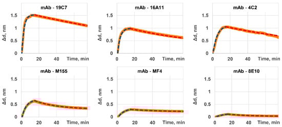 The developed approach enables other important aspects of antibody characterization, namely, investigation of their specificity and binding with non-target molecules, e.g., heterogeneic entities and other cardiac markers. To demonstrate this option, each one of the tested alternative cardiac markers (heart fatty acids binding protein—hFABP; N-terminal prohormone of brain natriuretic peptide—NT-proBNP) at a concentration of 3500 ng/mL was pumped at the stage of antigen passing. No one of the six studied antibodies exhibited a statistically reliable increase in biolayer thickness, which would indicate binding with hFABP or NT-proBNP. Apparently, that was due to the fact that the studied commercial antibodies were carefully investigated by the recognized manufacturer and selected for high specificity (among other properties).