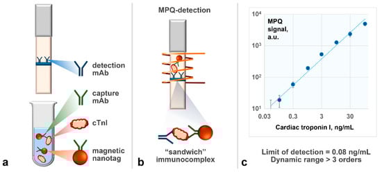 To realize a rapid sandwich-type immunoassay for quantitative detection of cTnI, we chose a lateral flow format (Figure 4a,b) based on magnetic nanotags registered by their non-linear remagnetization with a highly sensitive technique based on magnetic particle quantification (MPQ) principle (see details in the Materials and Methods section). The capture antibodies of 19C7 clone were covalently immobilized on a surface of 200-nm commercially available superparamagnetic particles using a carbodiimide method [,,]. The particles were added to the analyzed sample, where, if cTnI was present, the “19C7 clone antibody—Antigen” immune complexes formed. Then, a test strip with the pre-deposited antibody of 16A11 clone was immersed into the sample. That antibody bound to the antigen within the immune complex together with the magnetic nanotags. After the assay, the test strip was placed into the MPQ reader to measure the quantity of superparamagnetic particles bound at the test line, where the tracer antibody was deposited. The larger cTnI content in the sample, the higher the recorded magnetic signal.