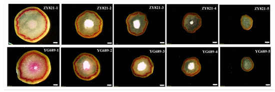 The stems of ZY821 and YG689 in the early flowering and maturation stages were used for the morphological and anatomical analyses. As shown in Figure 1C, the stem strength and dry weight of YG689 were significantly higher than that of ZY821. These results indicate that the YG689 had stronger stem lodging resistance than that of ZY821. To explore the difference in stem anatomical structure, the stems of YG689 and ZY821 were evenly divided into five sections from bottom to top (Figure 1B). It was revealed that the lateral distribution of lignin in YG689 was obviously wider than that of ZY821 (Figure 2). The stem anatomical structures between YG689 and ZY821 at the maturation stage were also compared, and similar results were obtained (Figure S1).