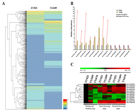 (A) Heatmap analysis of differentially expressed genes between YG689 and ZY821. RPKM (reads per kb per million reads) was used to calculate gene expression level. The color key (0, 2, 4, 6, 8, 10) represents FPKM normalized log(10) transformed counts. Red represents high expression and blue represents low expression. Each row represents a gene. (B) Validation of differentially expressed genes by RT-qPCR. Thirteen DEGs were randomly chosen for RT-qPCR validation using ZY821 transcript expression levels as the control. The relative expression levels of each gene are expressed as the fold change between ZY821 and YG689. The B. napus ACT 7 actin gene is used as an internal control. Histogram indicated the relative expression level between ZY821 and YG689 from RT-qPCR results and red square indicated the relative expression level between ZY821 and YG689 from RNA-seq. (C) Heatmap analysis of lignocellulose-related DEGs among ZY821, YG689, and TN070. The color key represents relative expression levels normalized log 2-transformed counts. Red represents high expression and green represents low expression. Each row represents a gene (n = 3).