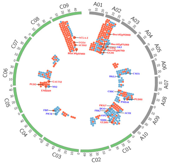 The distribution of the DEGs involved in KEGG pathways on B. napus genome. A01-A10 indicates 10 chromosomes of A genome in B. napus; C01-C09 indicates 9 chromosomes of C genome in B. napus. Red dots indicate up-regulated genes and blue dots indicate down-regulated genes. Large dots indicate 30 DEGs closely related to lignocellulose synthesis.