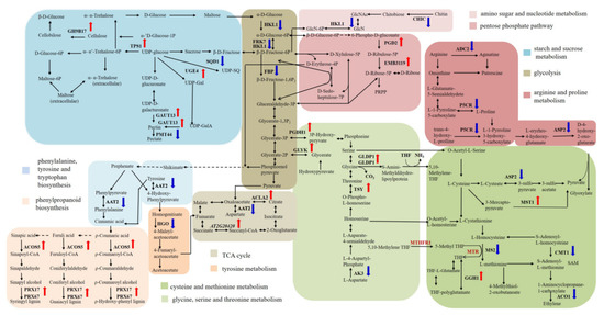 Analysis of metabolic pathways of the lignocellulose-related DEGs. The red arrows represent the up-regulated gene, and blue arrows represent the down-regulated gene.