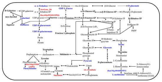 Six biological replicates of each stem sample (0.05 g per sample) of YG689 and ZY821 in the bolting, early flowering, and terminal flowering stages were collected. A total of 36 stem samples were extracted for the GC–TOF–MS analysis, as previously described [64]. An Agilent 7890 GC system equipped with a Pegasus 4D TOFMS (LECO, St. Joseph, MI, USA) was used for the GC–TOF–MS analysis. Metabolite quantification was performed using a multiple reaction monitoring (MRM) method, as described [65]. Statistical significance was defined at p < 0.05, with highly significant values at p < 0.01. The VIP (variable importance in the projection) value (threshold > 1) of the first principal component of OPLS-DA model and the p value of the t-test (threshold 0.05) are used to identify the differentially expressed metabolites.