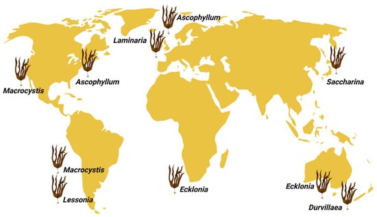 The generation of brown algae began in California in 1929; soon after, in 1939, it was developed in some European countries and Japan [137]. At present, there is a high regional imbalance in seaweed production [138]. Thus, 35.8 million tons of global seaweed production is contributed to by 49 countries/territories and 97% of the world production comes from Asia. Thus, the major producer countries per area are China, Indonesia, Republic of Korea, and Philippines in Asia. In Americas, Chile is the major producer at the same level of Japan. In Europe, Norway and France are the major producers but with production rates three and eight times lower than that of Japan, respectively. Alginates are derived from brown seaweed and are produced mainly in the USA, Norway, China, Canada, France, and Japan [139]. Among the advantages of obtaining alginate from brown algae is that most alginophytes have large quantities of the product and generate large areas on the rocky shores with little depth [140,141]. Figure 2 shows the areas where some algae used for alginate production are found throughout the world [142].